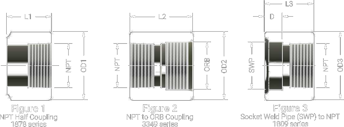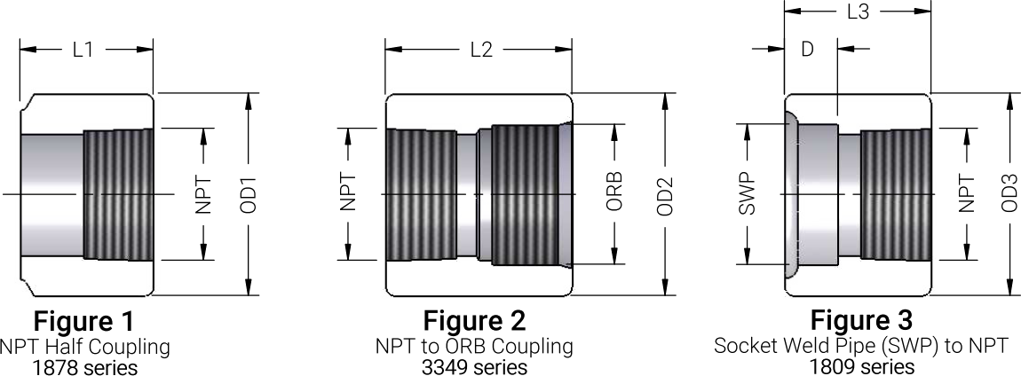 | Figure 1 Half Coupling | Figure 2 NPT/ORB | Figure 3 SWP/NPT | NPT Size | SWP (OD) | OD1 | OD2 | OD3 | D | L1 | L2 | L3 |
