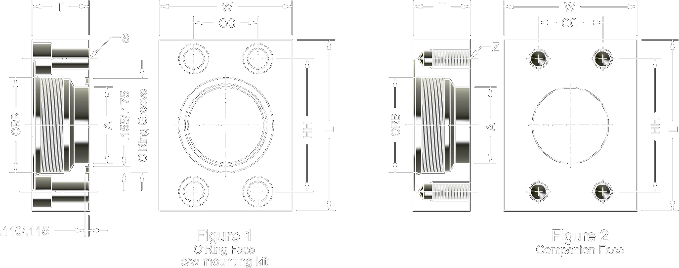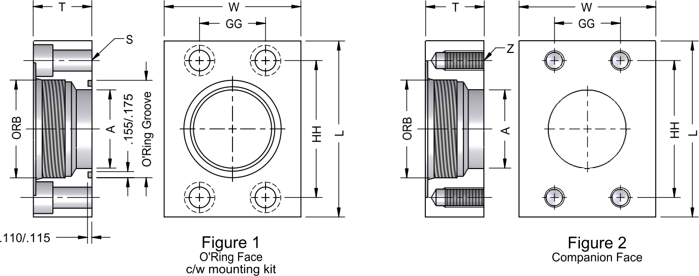 | Figure 1 O-Ring Face | Figure 2 Companion Face | ORB (thread) | Flange Size | O-Ring Groove | A | S | Z | GG | HH | L | W | T |